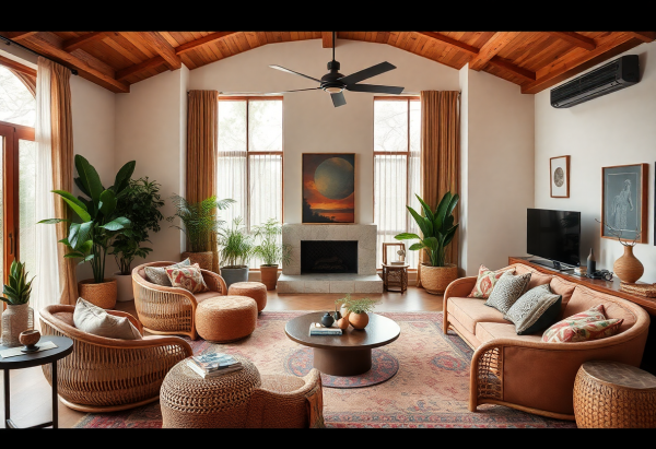 Bohemian architecture-interior design style encompasses a free-spirited, eclectic mix of elements and cultural influences. It embraces curved and organic shapes, rich textures like woven fabrics and tapestries, natural materials such as wood and rattan, vibrant and earthy colors like jewel tones and warm neutrals, playful patterns, and an abundance of plants and artworks.