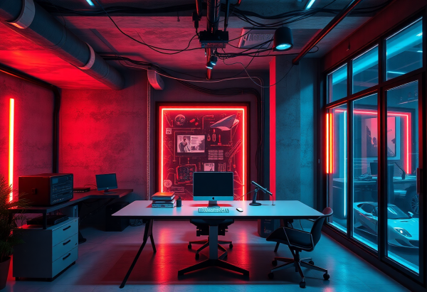 Cyberpunk architecture-interior design is characterized by futuristic shapes, angular structures, and dynamic lines. It incorporates a variety of textures and materials, including concrete, metal, glass, and exposed wiring. The color palette typically includes neon hues, vibrant pops of color, and dark shades.