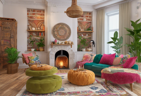 Bohemian architecture-interior design style encompasses a free-spirited, eclectic mix of elements and cultural influences. It embraces curved and organic shapes, rich textures like woven fabrics and tapestries, natural materials such as wood and rattan, vibrant and earthy colors like jewel tones and warm neutrals, playful patterns, and an abundance of plants and artworks.