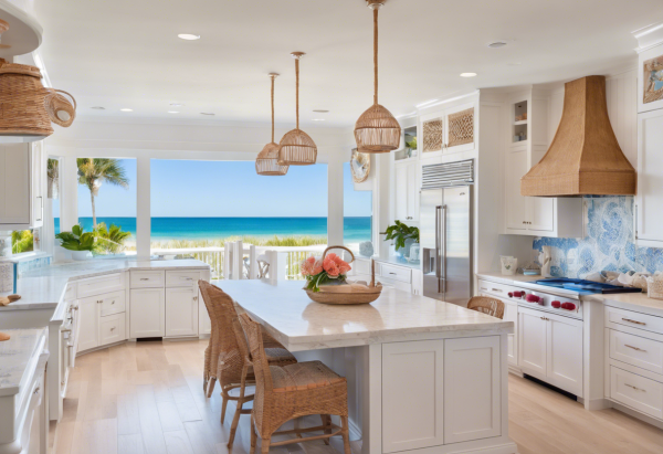 Coastal architecture-interior design embodies a serene and beachy atmosphere. It showcases organic shapes inspired by seashells, waves, and sand dunes. The use of light and breezy textures like linen and rattan, complemented by natural materials like driftwood and wicker, create a relaxed coastal vibe. The color palette includes soft blues, sandy beiges, coral pinks, and crisp whites, reflecting the coastal elements of the sea, sky, and sand.