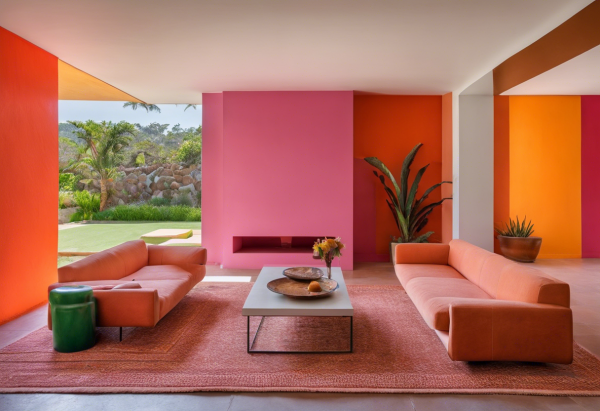 Luis Barragán's architecture-interior design style is characterized by his innovative use of vibrant colors, bold geometric shapes, and meticulous attention to light and shadow. His compositions evoke a sense of serenity and harmony, combining modernist principles with traditional Mexican elements to create a unique and poetic living experience.