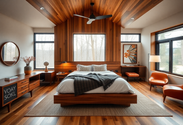 Mid-Century Modern architecture-interior design style is characterized by clean lines, asymmetrical shapes, and a combination of organic and geometric forms. It embraces natural textures like wood, stone, and leather, often with a mix of smooth and textured surfaces. The color palette focuses on earthy tones and vibrant pops of color, with a preference for neutral backdrops.