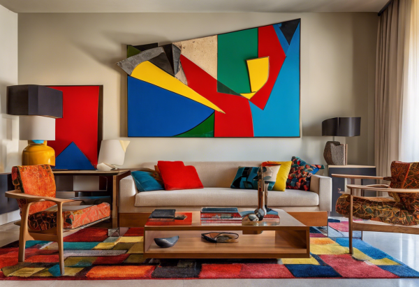 The Picasso-inspired architectural-interior design style embraces the abstract and cubist elements found in Picasso's artwork. It incorporates bold geometric shapes, asymmetry, and unique angles. The design features a mix of smooth and textured surfaces, with a combination of contrasting materials such as concrete, glass, and wood. The color palette is vivid and eclectic, with pops of primary colors and contrasting tones.